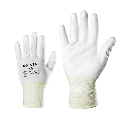 Õhukesed polüesterkindad PU kate peopesas, valge